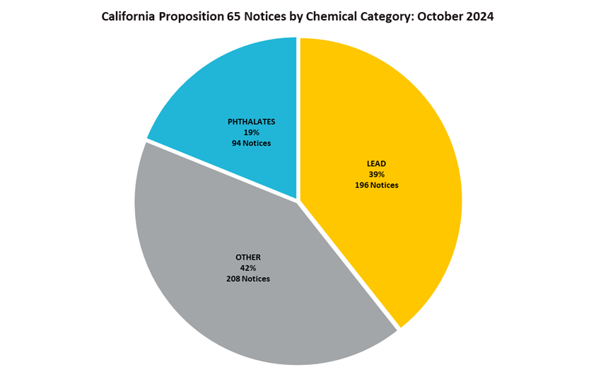 In October 2024, there were 498 60-day notices for violation of Prop 65, of which 43% of the notices served were for the category of Lead, 11% of notices were served for the presence of Phthalates, 46% of the notices were for the presence of Other chemicals.